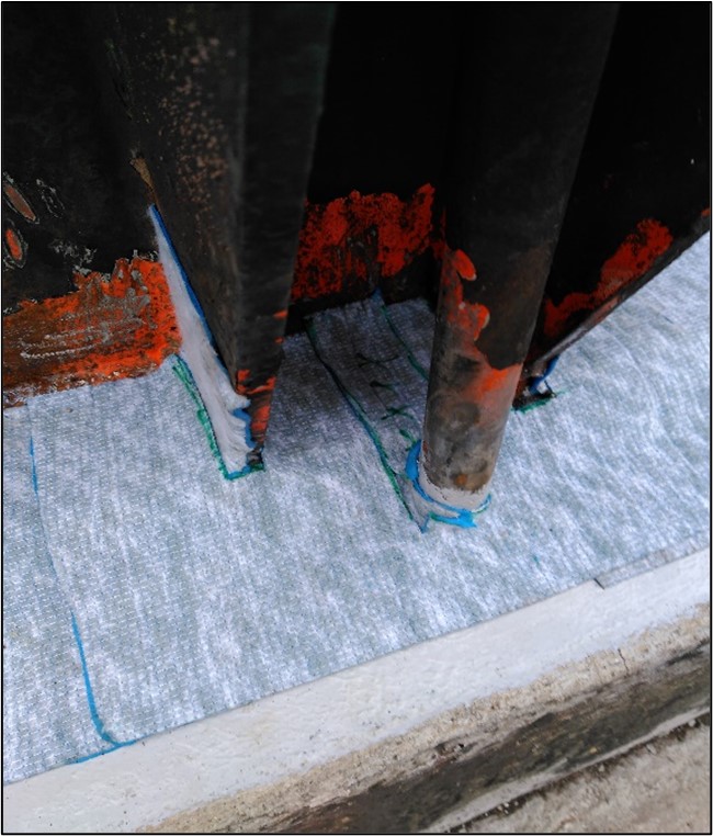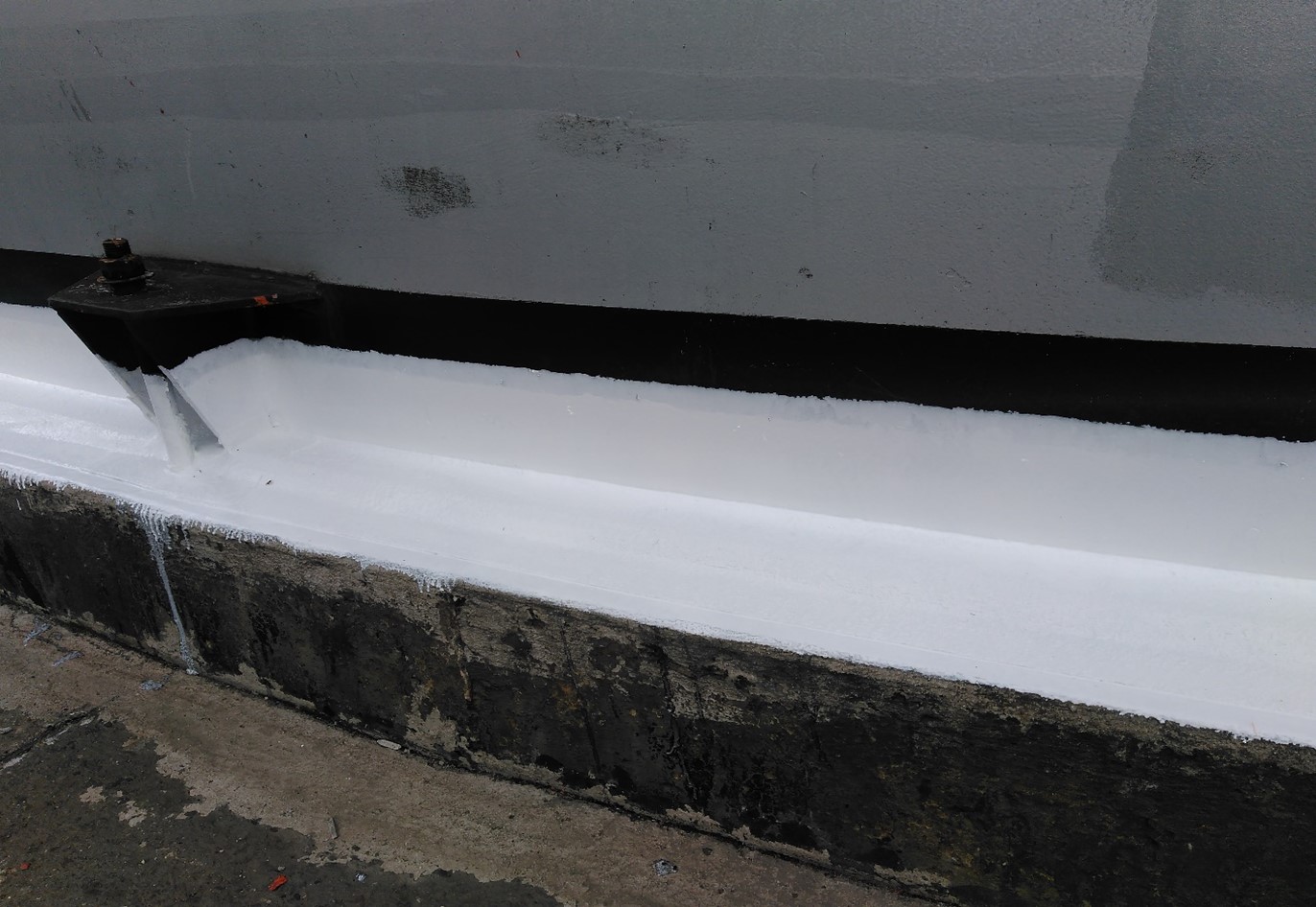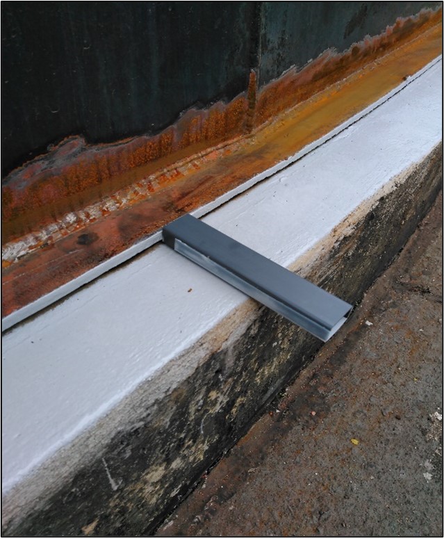 Prior to installation, the tank chime interface was cleaned and coated with Macropoxy 646 Concrete Primer. Corrosion Monitoring Coupon Assemblies were then embedded beneath the tank floor plates at the chime interface to track inhibitor effectiveness. Zerion™ FVS-S15 Sleeves were placed around the perimeter, covered with Sealant Tape, and sealed with multiple layers of protective Topcoat to complete the Chime Ring IDS.